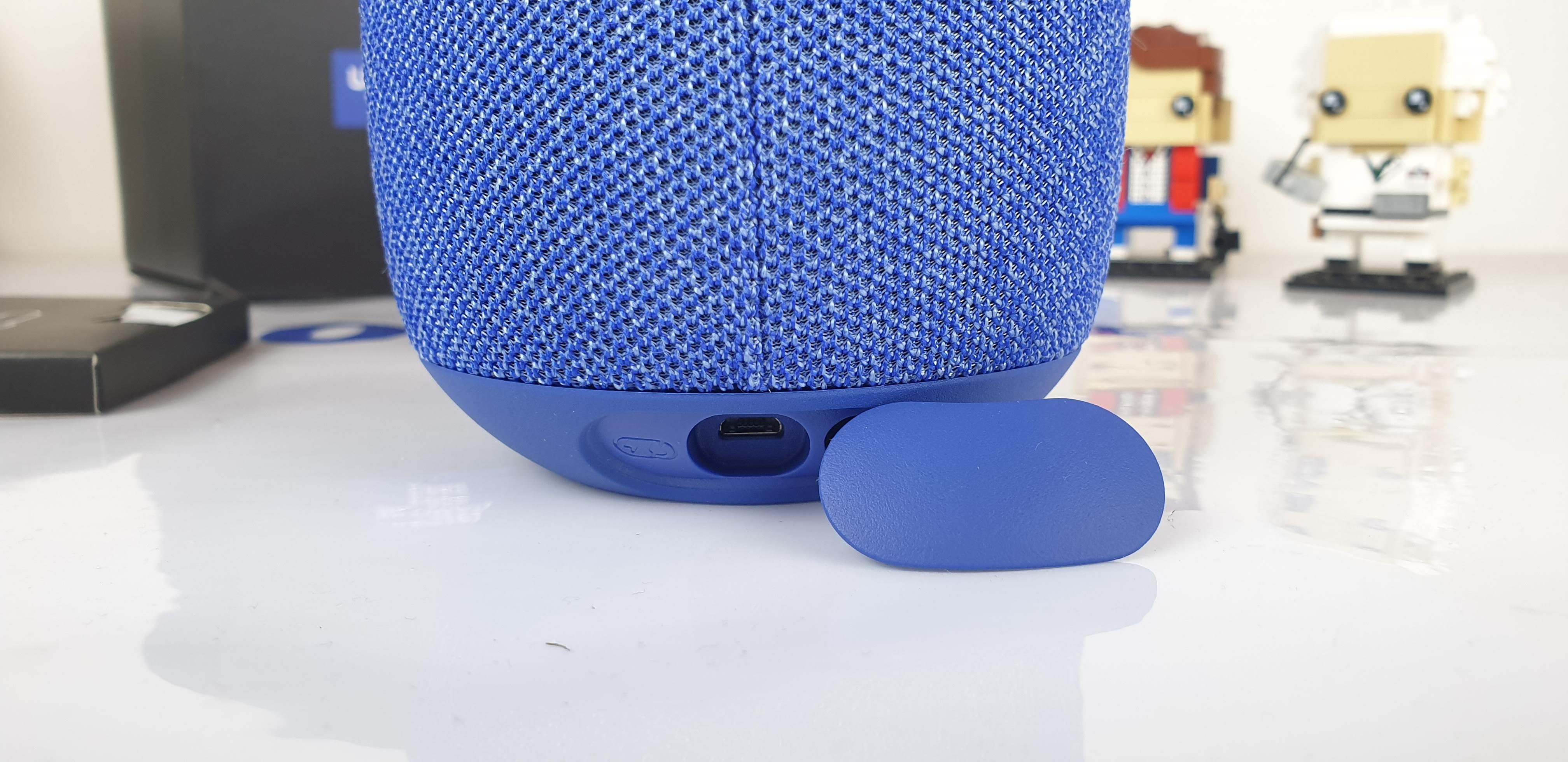 La cassa è realizzata in plastica gommosa, per le parti alta e bassa, ed in tessuto avvolgente, per corpo centrale. Nel mezzo della parte centrale sono posizionati gli enormi, e molto comodi, pulsanti per la regolazione del volume. Nella parte alta dello speaker trovano posto il tasti e led per l’accensione e la connessione Bluetooth ed un pulsante Play con varie funzioni, a questi si aggiunge una pratica maniglia per trasportarlo e agganciarlo. La maniglia torna comodo per posizionarlo al meglio anche in doccia. Nella parte inferiore sono posizionati, una porta microUSB protetta da un guscio, ed un pulsante per l’attivazione della modalità da esterno.