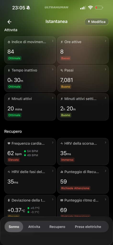 Prima di procedere entrando nel vivo dei dati ti parlo brevemente dell’app. L’app Ultrahuman è migliorata tantissimo nel corso del tempo, sono arrivati tantissimi aggiornamenti e tutti i dati sono mostrati in maniera chiara nelle varie schermate con grafici, dati e statistiche. Gli aspetti più interessanti sono legati alla possibilità di entrare nel dettaglio delle varie misurazioni, infatti cliccando sui vari dati entriamo in grafici e dati ancora più avanzati ed approfonditi che permettono di realizzare delle analisi più precise, e poi c’è l’interessante possibilità di ampliare le funzionalità installando dei moduli aggiuntivi chiamati Power Plugs, alcuni gratuiti ed alcuni a pagamento, che di aggiungere funzionalità specifiche come il tracking di ciclo ed evoluzione, della vitamina D, il tempo passato davanti lo schermo, le finestre per l’assunzione della caffeina e molto altro.