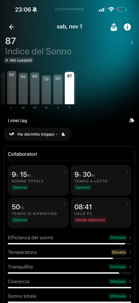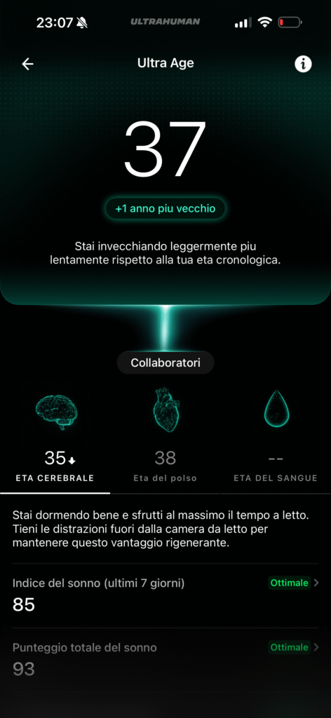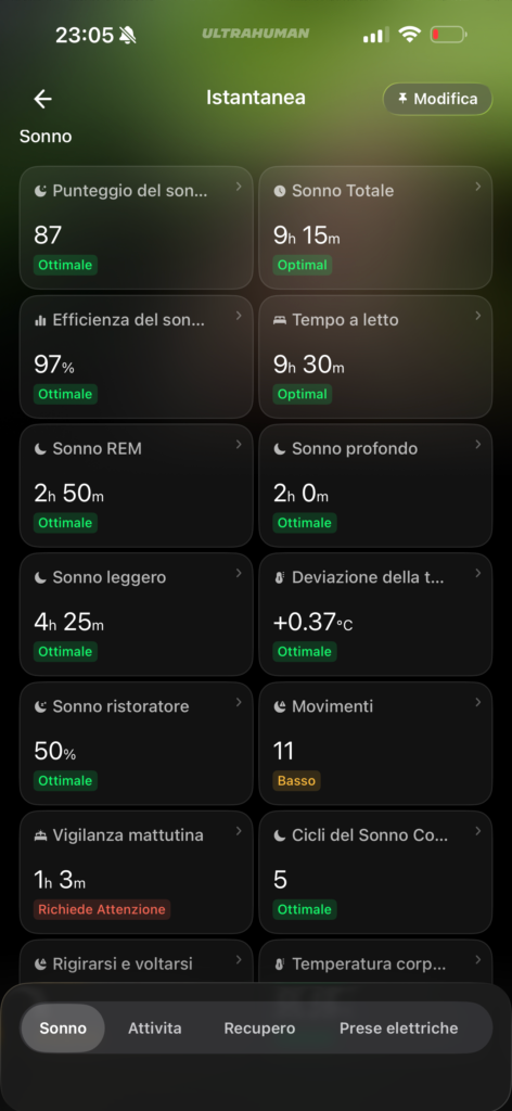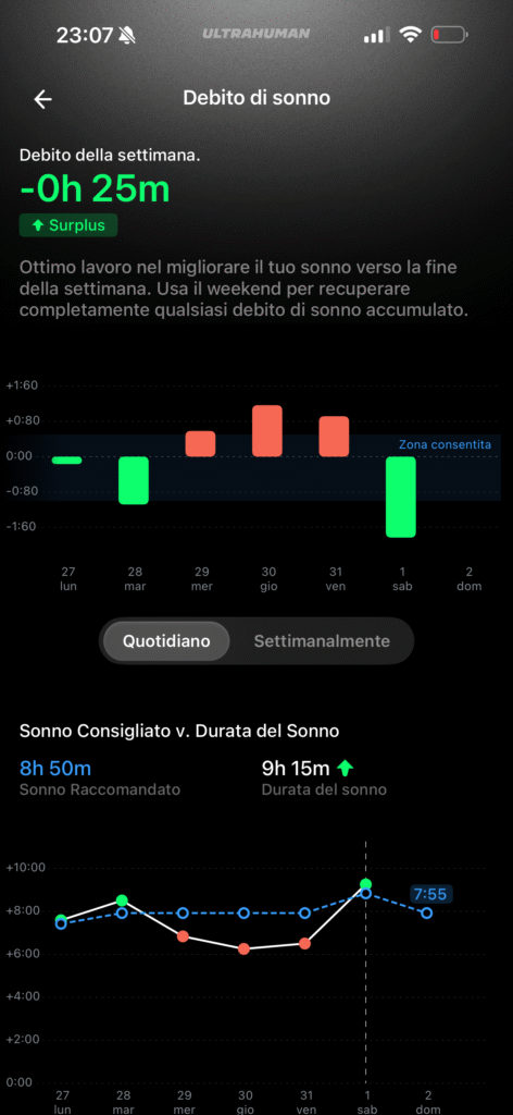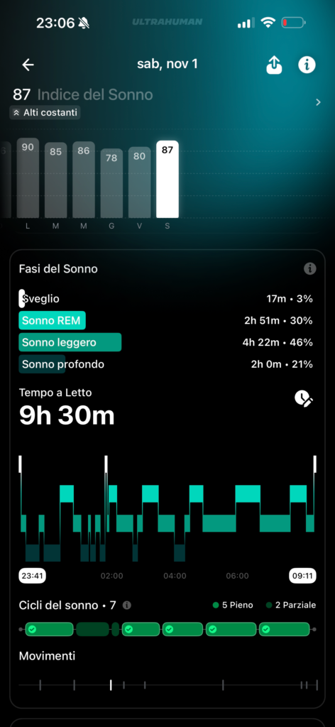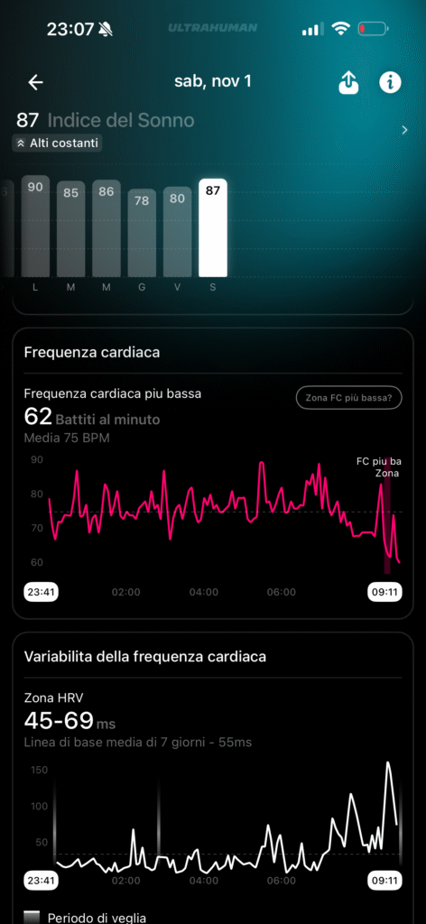 Non ho raffronti medici, ma ho trovato i dati più corretti ed allineati al mio status fisico e mentale rispetto a quelli misurati da Apple Watch. Mi è capitato più di una volta di aver dormito male, con vari risvegli notturni, e di sentirmi a pezzi appena alzato e di ritrovarmi con punteggi del sonno altissimi misurati da Watch Ultra 2, ma decisamente più bassi misurati da Ultrahuman Ring Air.