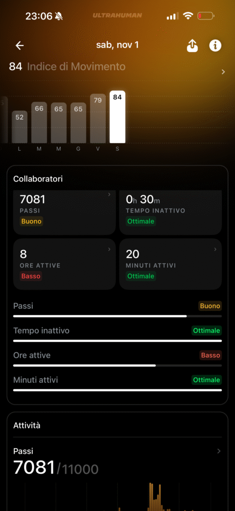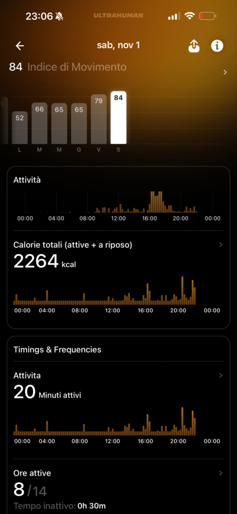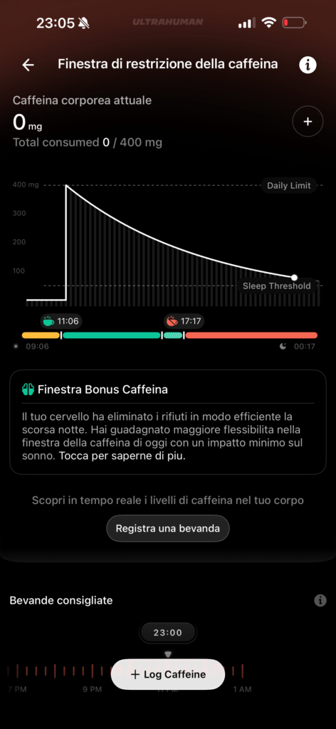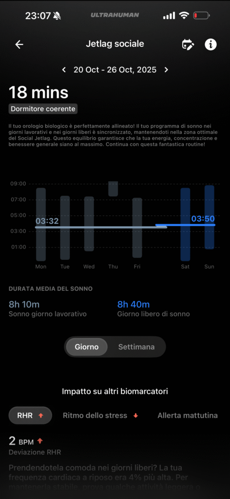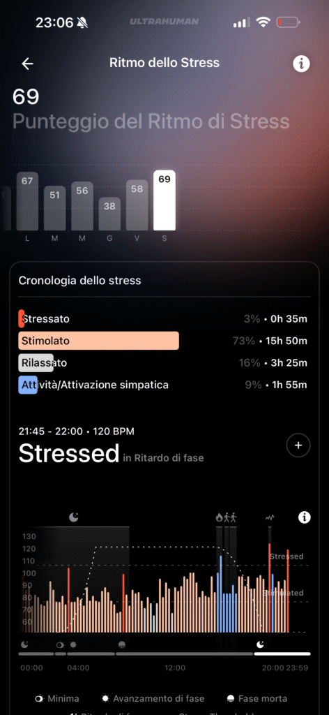 Dall’app Ultrahuman possiamo attivare strumenti per il tracking del Ritmo Circadiano per capire come il regolare al meglio il tuo orologio biologico, suggerendo quando esporsi alla luce solare e quando evitare gli schermi (schermo blu), su come gestire le finestre per la caffeina, funzione molto apprezzata visto che bevo molti caffè, che ti dice qual è l’orario migliore per assumere stimolanti, in base ai tuoi dati di sonno e attività, per assicurarti che la caffeina sia smaltita prima di andare a letto oppure abbiamo uno Stress Rhythm che traccia i livelli di stress durante il giorno, offrendo un punteggio continuo e suggerendo esercizi di respirazione.