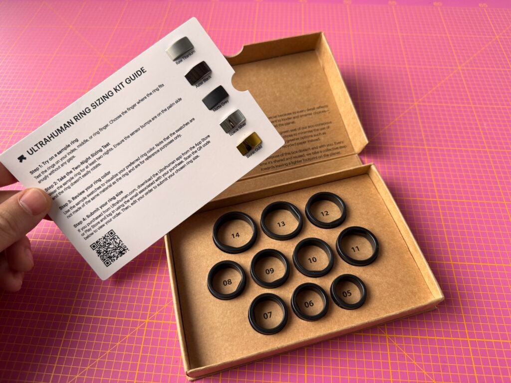 Per farla molto breve, prima dell’acquisto definitivo ci arriva a casa un size kit gratuito che contiene al suo interno degli anelli di plastica delle stesse dimensioni del modello finale, ma con le differenti taglie disponibili, dalle 5 alle 14 senza mezze misure, in modo da avere tutto il tempo di provare l’anello con calma e di scegliere la taglia giusta. Nelle prime ore ho indossato la taglia 9 che era quella che mi sembrava corretta, ma mi sono rapidamente reso conto che era troppo stretta. Sono passato quindi alla taglia 10 e dopo averlo indossato per due giorni, una volta che ero sicuro che fosse la taglia corretta, ho confermato l’ordine sul sito di Ultrahuman, che tra l’altro è davvero ben fatto.